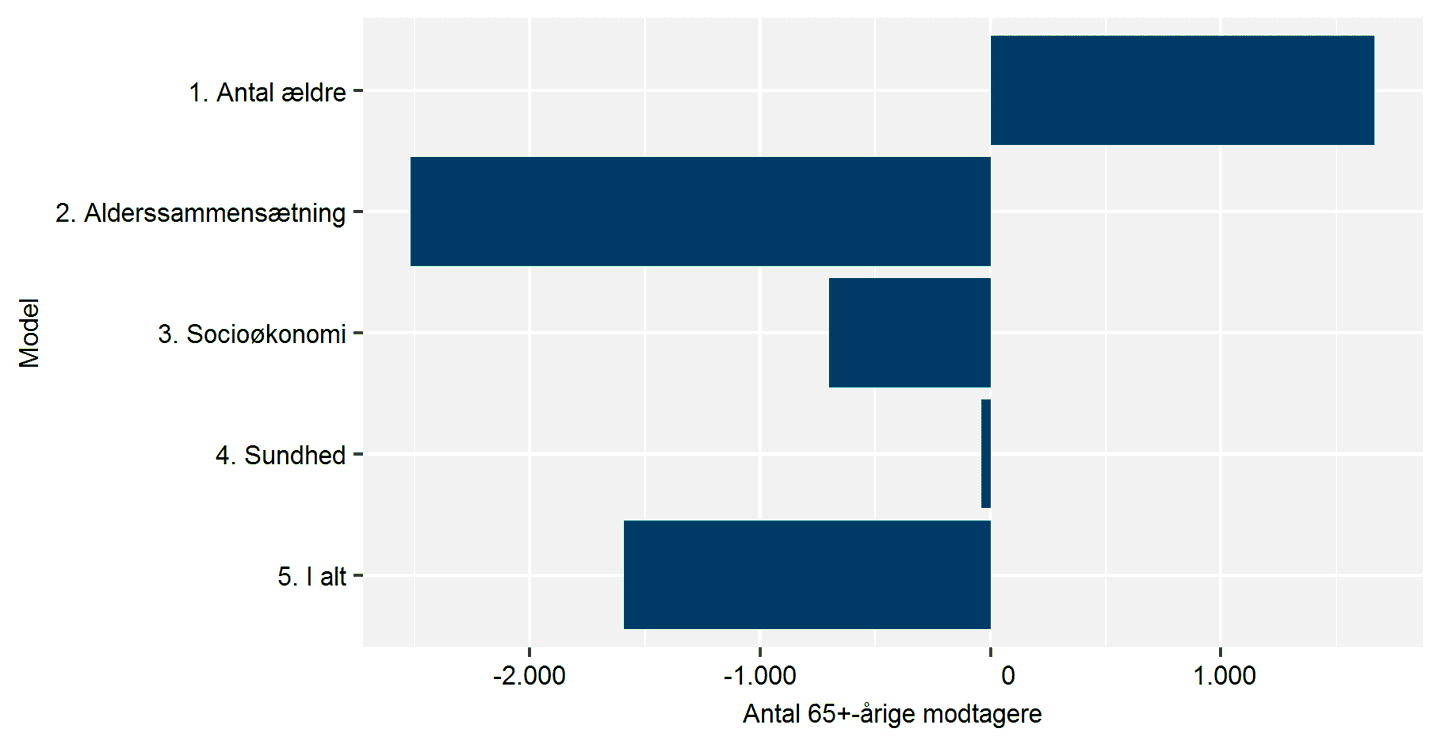 Disse fire faktorer kan altså bruges til at give et samlet billede af, hvor stort kommunens pres på udgifterne til ældrepleje bliver. Grafikken viser, hvordan de fire faktorer påvirker antallet af ældre københavnere, der forventedes at have behov for pleje i perioden 2010 til 2016. Den første søjle viser, at det forventede plejebehov steg, fordi antallet af ældre steg. De tre næste søjler viser, at plejebehovet til gengæld faldt, fordi Københavns Kommune har mange ’unge’ ældre med en god socioøkonomisk baggrund. De ældres sundhedstilstand havde kun en lille betydning for plejebehovet i perioden.