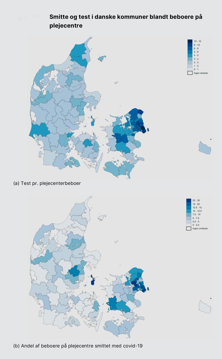 Figuren herunder viser antallet af test pr. plejecenterbeboer (panel a) samt andelen af borgere på plejecentre, der er fundet smittet med covid-19 (panel b). Det fremgår af figuren, at der både er kommunal og regional variation, og at Region Hovedstaden generelt set er den region, hvor der er testet mest – og hvor der er fundet flest smittede og afdøde borgere med covid-19 på plejecentre.