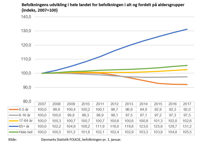Samlet set er befolkningstallet i Danmark steget med knap seks procent fra 2007 til 2017, viser dette notat. Samtidig har fordelingen af aldersgrupper ændret sig drastisk i perioden.