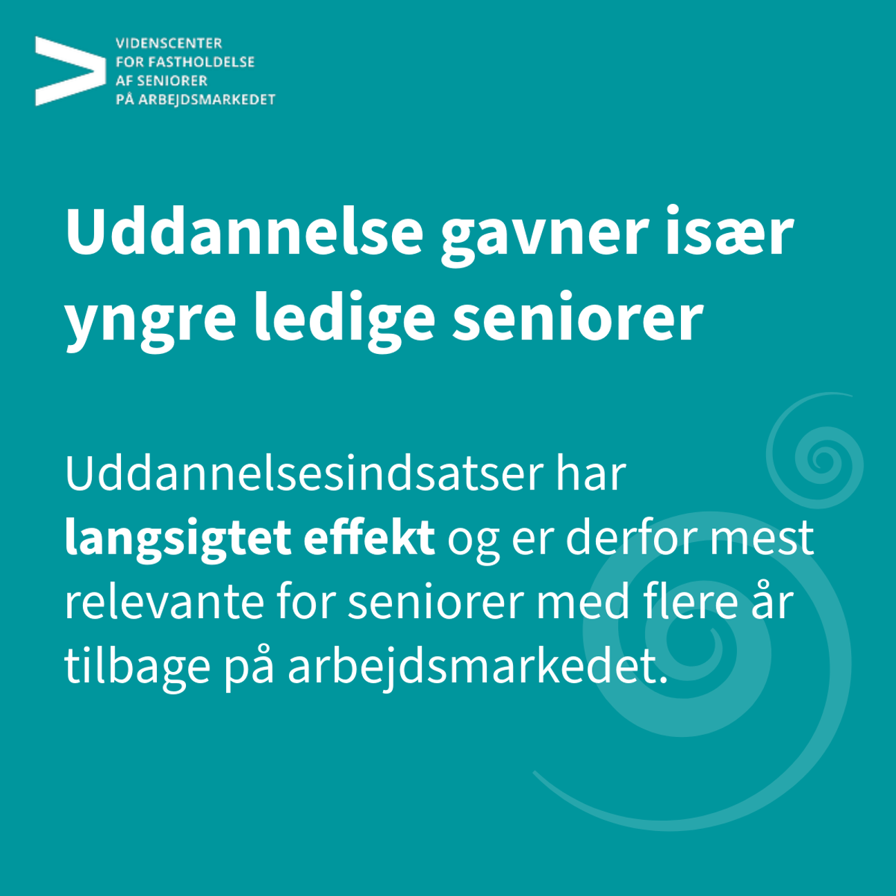 Endelig peger analyserne på, at forskellige indsatser har forskellige effekter for yngre og ældre seniorer. For de ældste seniorer, der er tæt på folkepensionsalderen, ses der (i gennemsnit) ingen effekter. For de yngre seniorer virker jobrettede indsatser positivt på beskæftigelsen, men kun på kort sigt (op til 12 måneder efter påbegyndt ledighed), mens uddannelsesindsatser har positive effekter på lang sigt (efter mere end 24 måneders ledighed).